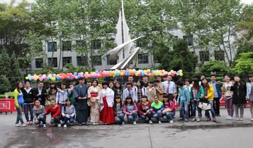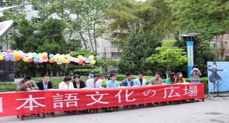 十八日下午,文化广场上悬挂着彩色气球,展示了正宗日本漫画并有身着和服和Cosplay的学生模特,吸引了大批学生和老师前来观看。下午四点半文化广场活动正式开始,外教赤松秀夫做了开场发言。之后由13级日语一班的同学演唱了歌曲《四季歌》,紧接着外教赤松秀夫带领12、11级日语专业学生演唱了多首日语歌曲,然后进行了“日语传话”、“日语常识抢答”以及“逢三过”等趣味性活动,将现场气氛掀到高潮。参与活动人员均有日本式礼物相送。与此同时,活动现场的嘉宾和观众品尝了正宗寿司,体验了日本饮食文化。活动结束后全体日语专业师生合影,为本次日语文化广场活动划上了圆满的句号。